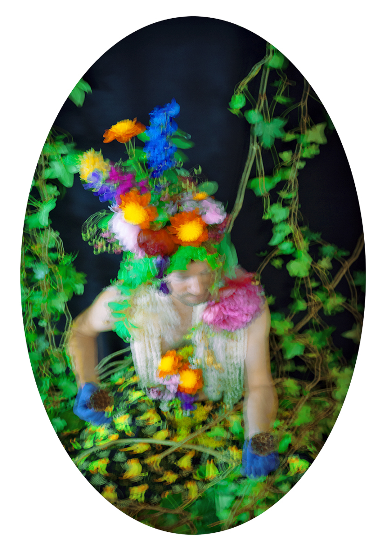 Mon travail emprunte au langage de la photographie de mode : des  images fortes, construites, visuellement séduisantes, au service d’une  idée. J’imagine et réalise l’ensemble des éléments présents dans  l’image — dessin, body painting, masques, accessoires, couture,  scénographie — en utilisant la photographie comme espace de synthèse.