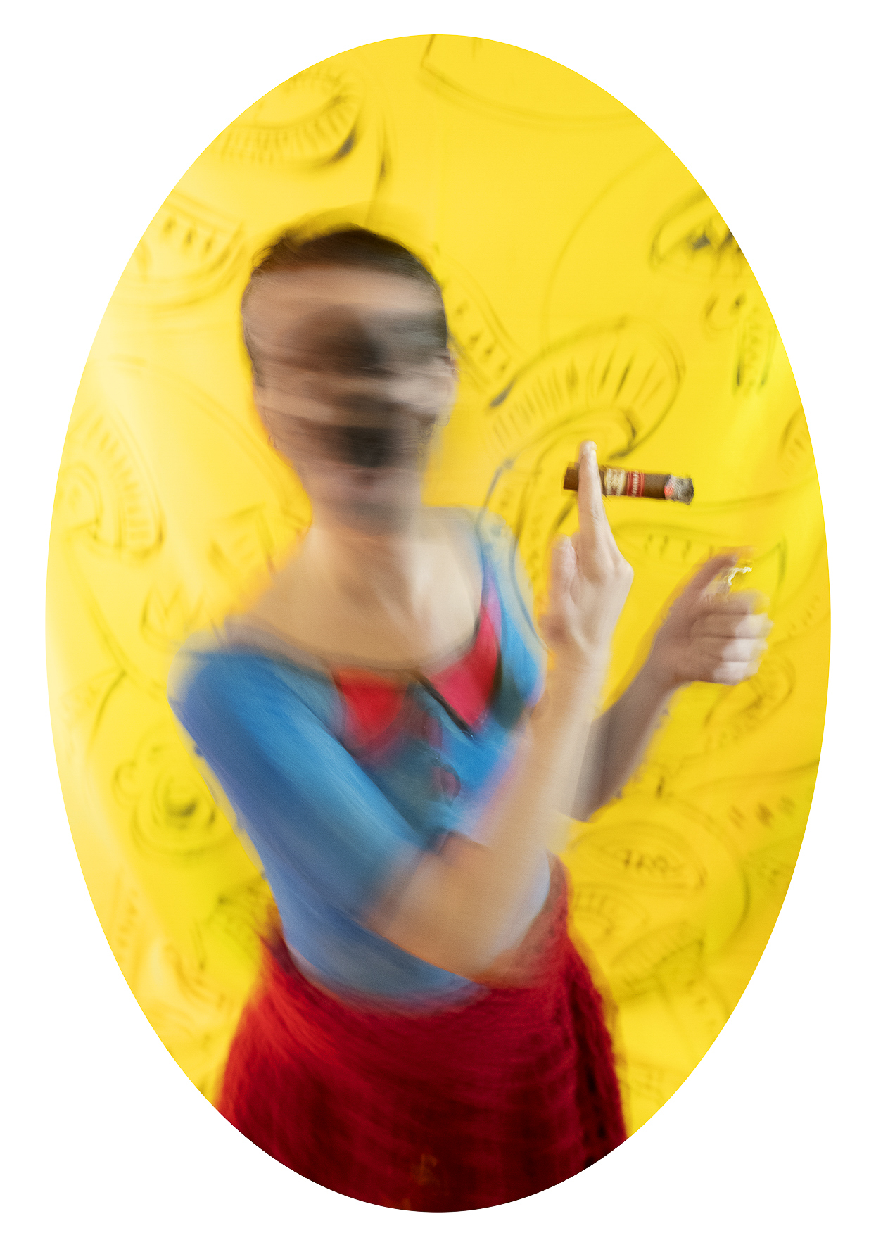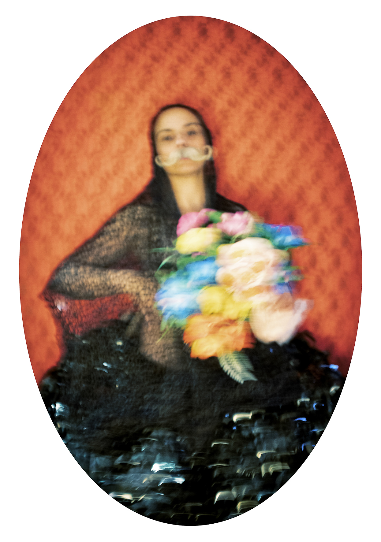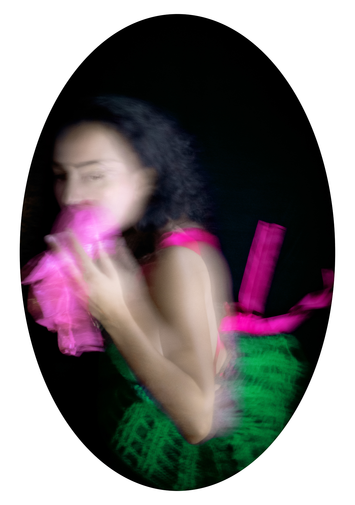 As a Franco-Chilean artist who has lived in Paris for over twenty years, I  embrace a dual cultural heritage that informs my references, my color  palette, and my underlying sense of humor. Movement softens the  intensity of the subject matter and brings rhythm to the viewing  experience. The oval format, inspired by 19th-century European  portraiture, lends the project a sense of timelessness.