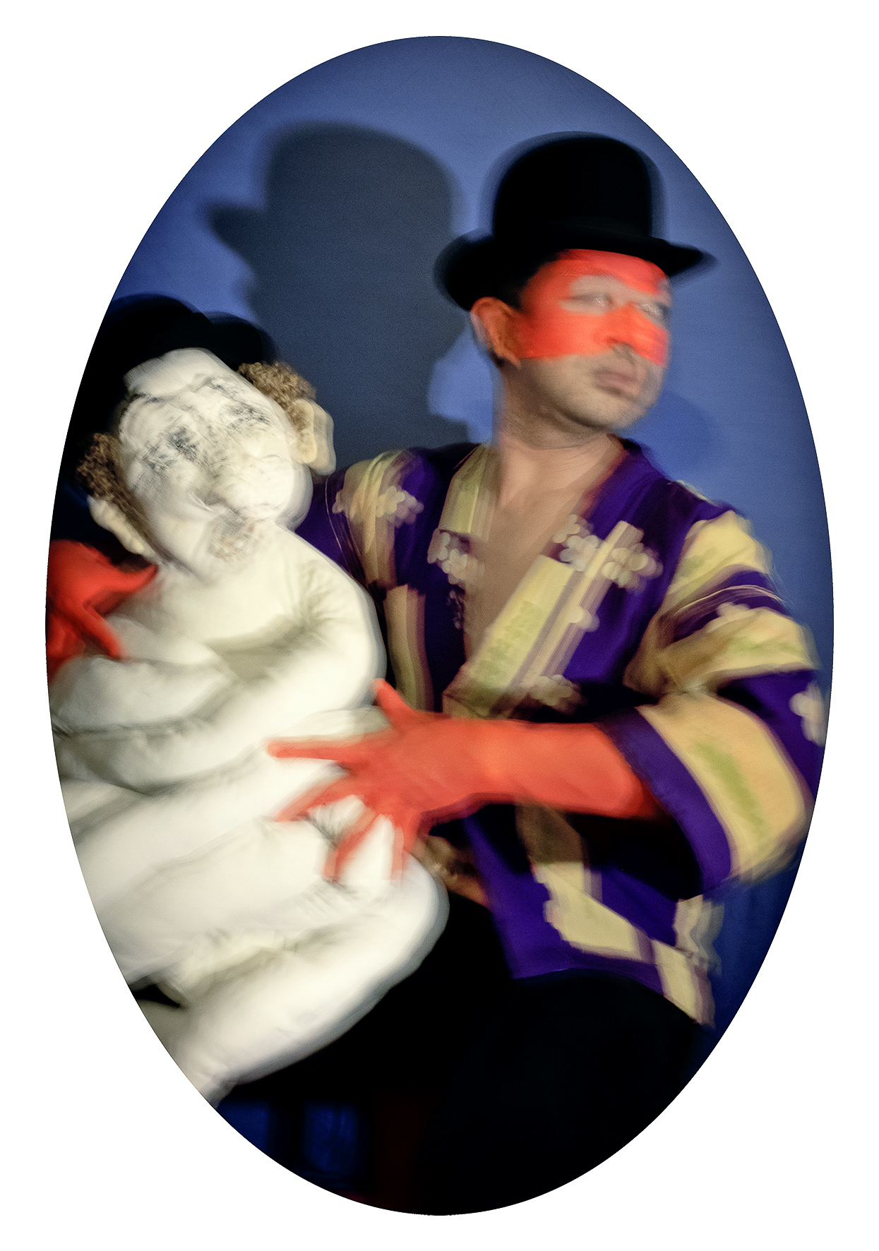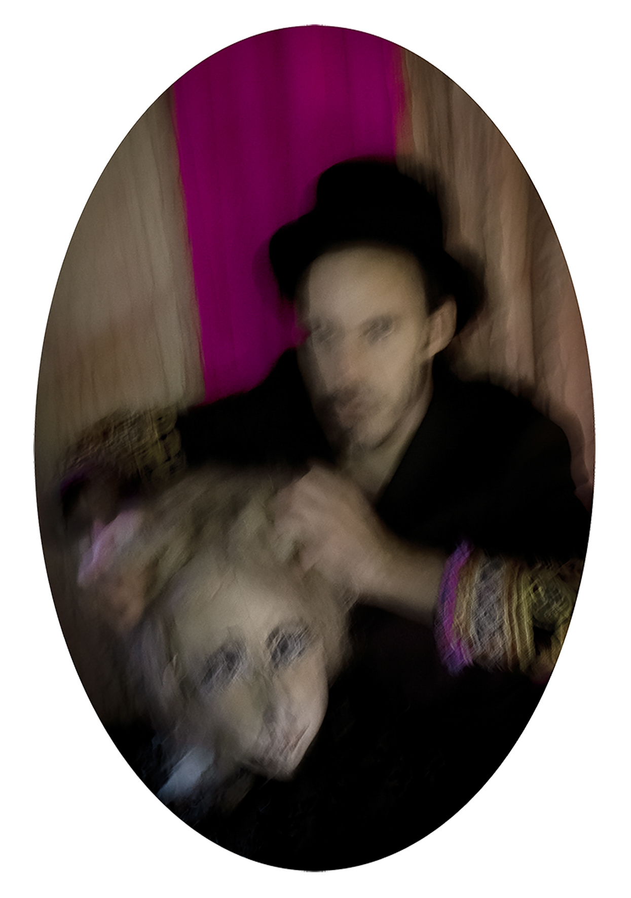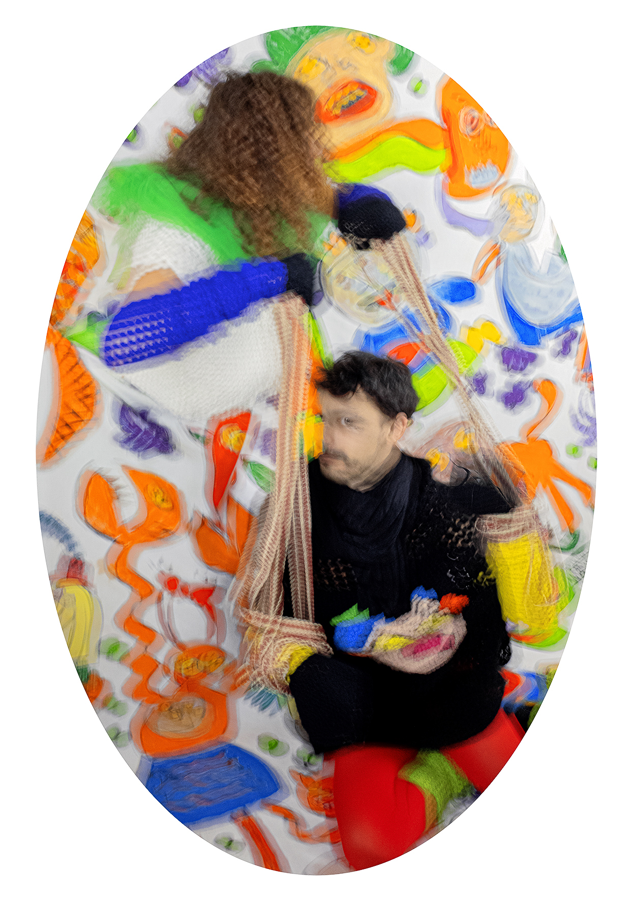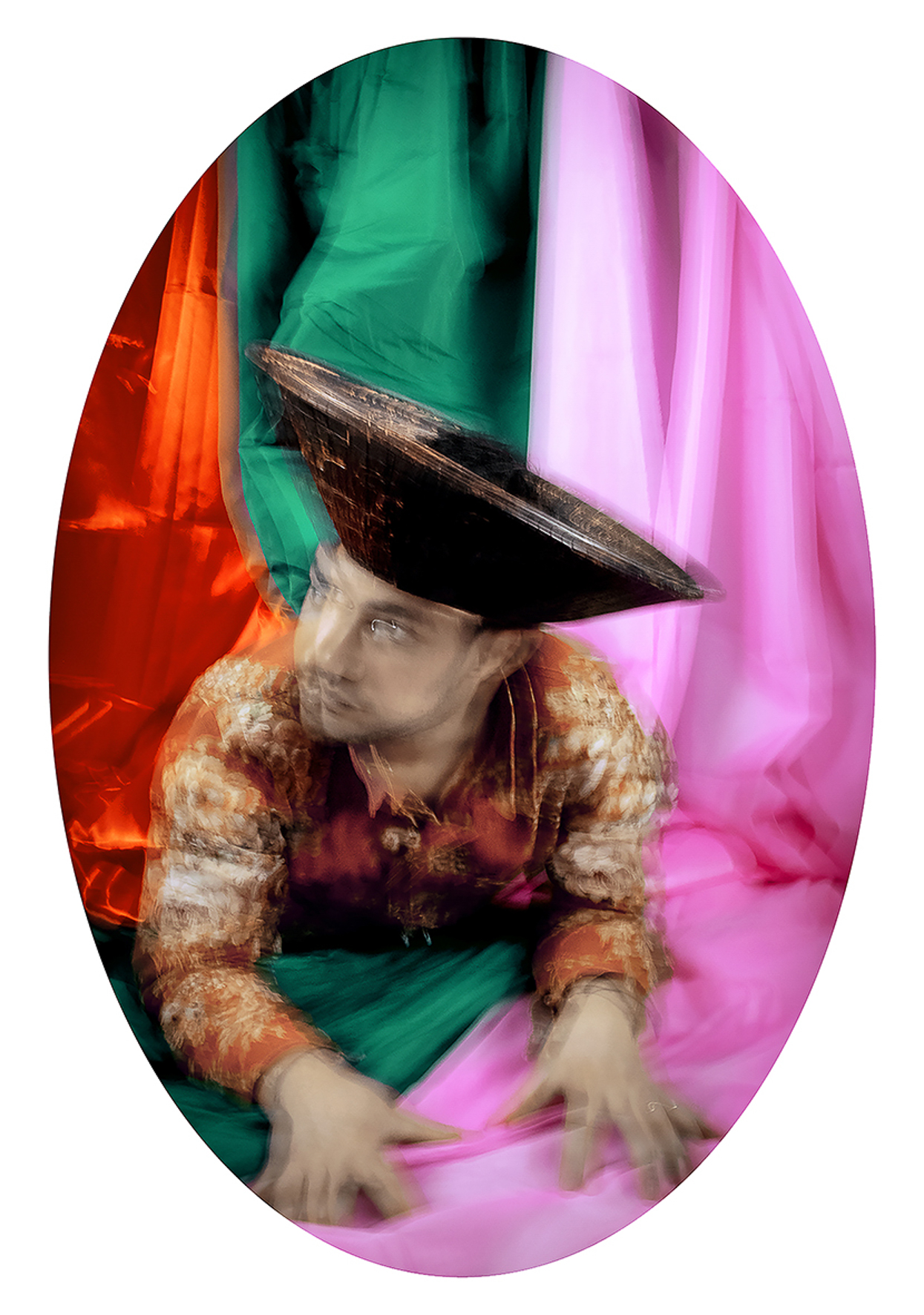 Franco-chilien, vivant à Paris depuis plus de vingt ans, je revendique  une double culture qui nourrit mes références, ma palette chromatique  et un humour sous-jacent. Le mouvement adoucit la densité du propos  et rythme la lecture. Le format ovale, inspiré des portraits européens du  XIXe siècle, inscrit le projet dans une forme d’intemporalité.